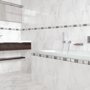 Made in Spain Soft white Calacatta look with light marble veining 10"x13" glossy white body ceramic wall tile 13"x13" matte porcelain floor with matching 2"x2" square mosaic Bullnose available to match the 10"x13" Easy to clean and maintain