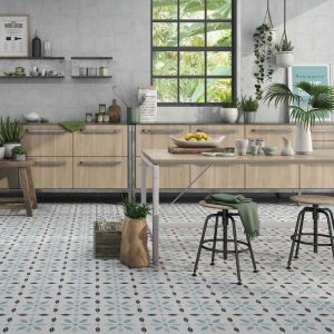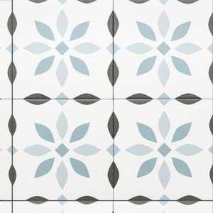 Merola Tile's Denia Gris Porcelain tile is a stunning encaustic tile inspired by traditional Spanish patterned home designs made to bring boldness and complexity to your home. Its shades of grey on a white background solidify this tile as a customer favorite. Denia is made from sturdy porcelain that will provide you with easy upkeep. Our Denia Gris tile comes in a traditional matte finish, making this tile stick out as a sleek, reformed version of what an encaustic tile should be. This tile is perfect for use on bathroom walls and floors, shower walls and floors, kitchen backsplashes, mudroom entryways, or as a feature wall installation.