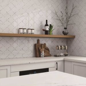 Elevate your space with the timeless allure of Merola Tile's Akoya Pearl Statuario Recycled Glass Glossy Mosaic. Featuring a stunning calacatta color palette, these mosaic tiles offer an effortlessly elegant aesthetic, exuding a high-end vibe that enriches any room.