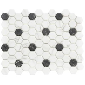 2. Timeless Hex Pattern 1"x1" Venato White Nero Marquina Recycled Glass Matte Mosaic $34.42 pcs.